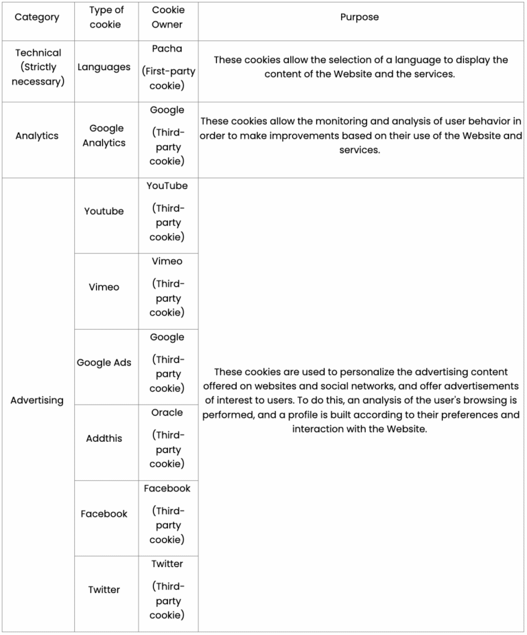 For the purposes of this Cookie Notice, “User” shall be understood as any natural person who uses the Website. The User is hereby informed that third party cookies used on the Website are not controlled by Pacha but by the corresponding third party. You will find detailed information on the third parties that install cookies on the Website below.