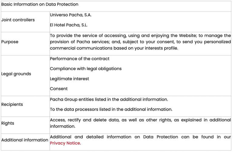 We, as Joint Controllers, have agreed that you may exercise your rights by simply contacting us through lopd@pacha.com or by sending a letter by regular post to C/ Canarias 37, Ed. Cetis, Torre 4, Pta. 4º, CP: 07800, Ibiza, Balearic Islands, Spain. Please note that in case we have not enough information to identify you and proceed with your request, we may have to ask you for further information.